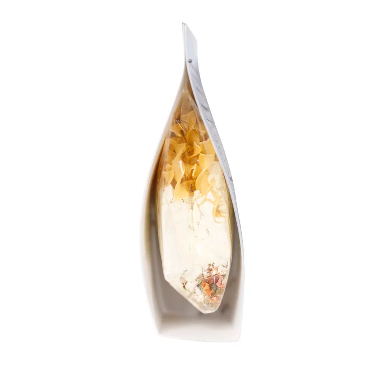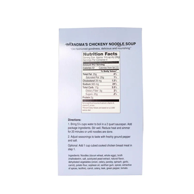 Noodles (durum wheat, whole eggs), broth (maltodextrin, sea salt, autolyzed yeast extract, natural flavor, onion, celery, parsley, spinach, garlic, carrot, potato flour, soybean oil, spices, extractive of spices, lecithin), onion, celery, leek, green pepper, tomato.